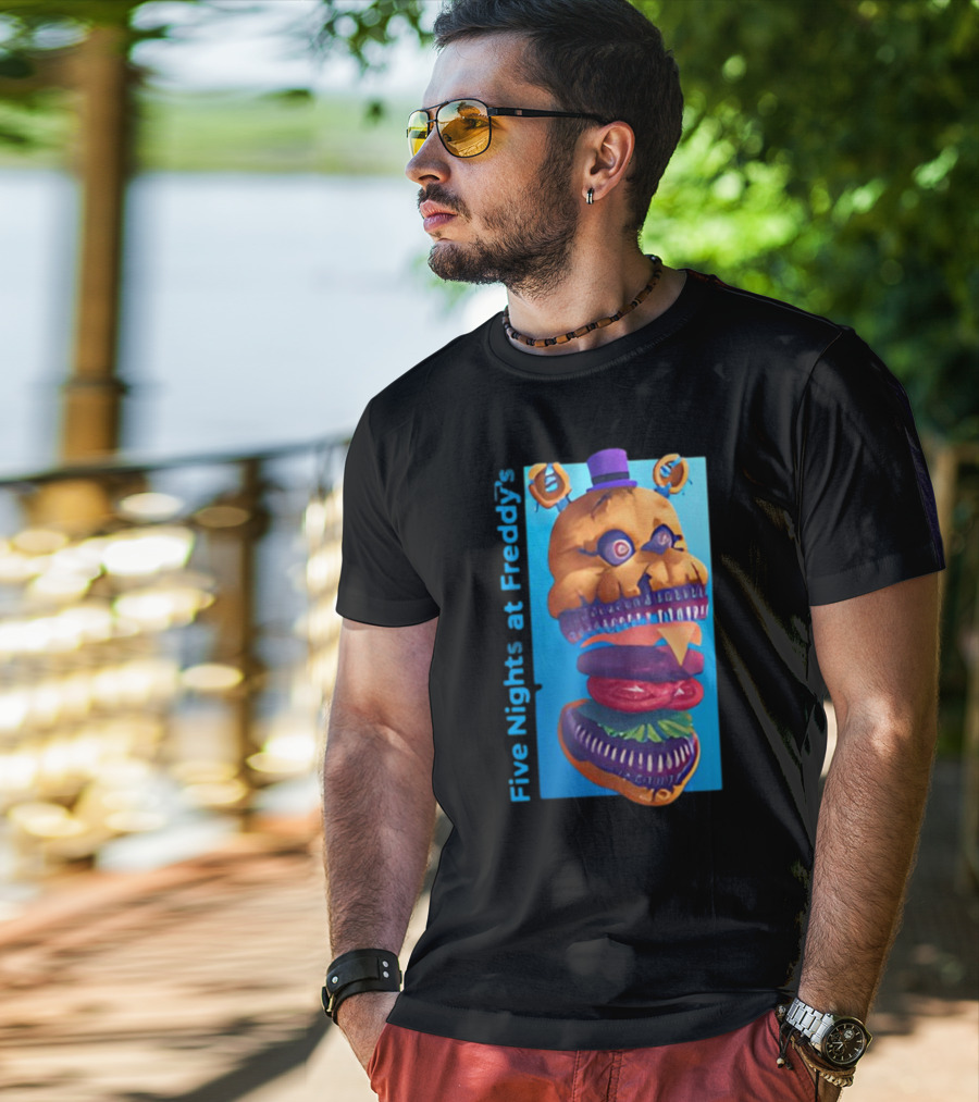Five Nights at Freddy's Midnight Snack Jonnyblox Burger Animatronic Shirt made from 100% pre-shrunk ring-spun cotton, unisex regular fit based on U.S. standard sizing. The shirt is designed, cut, sewn, and printed in the United States. Available in sizes S-5XL.