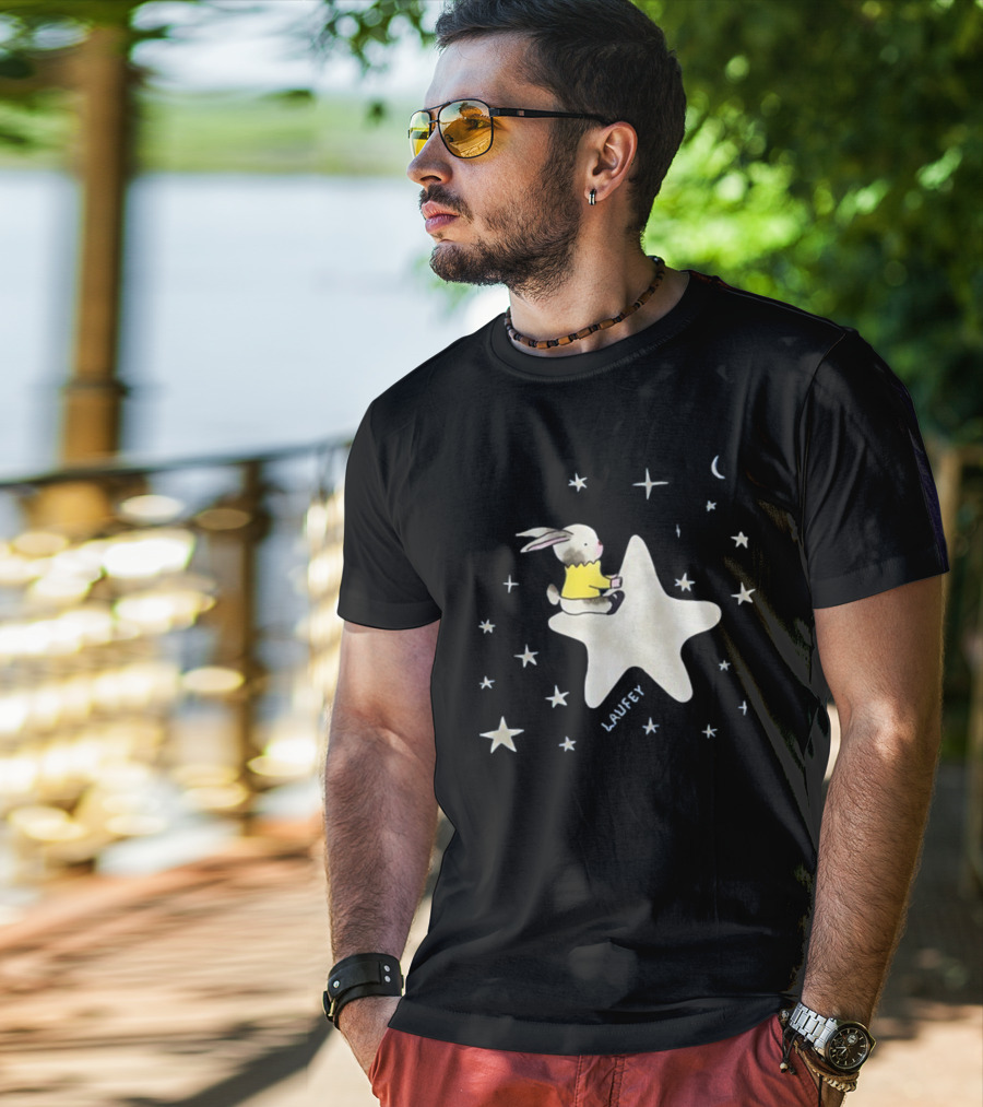 Laufey Celestial Bunny on Starry Night Shirt made from 100% pre-shrunk ring-spun cotton, unisex regular fit based on U.S. standard sizing. The shirt is designed, cut, sewn, and printed in the United States. Available in sizes S-5XL.