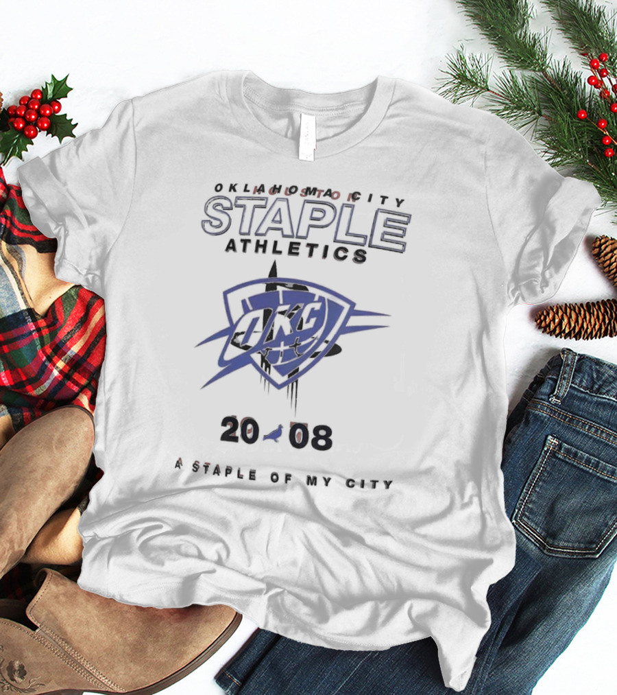Oklahoma City Staple Athletics OKC Thunder 2008 A Staple of My City Shirt made from 100% pre-shrunk ring-spun cotton, unisex regular fit based on U.S. standard sizing. The shirt is designed, cut, sewn, and printed in the United States. Available in sizes S-5XL.