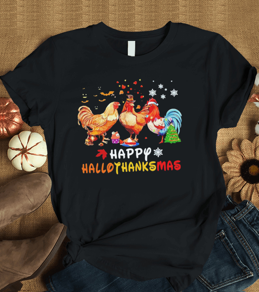 Happy Hallothanksmas Chickens Halloween Thanksgiving Christmas Rooster Festive Humor T-Shirt