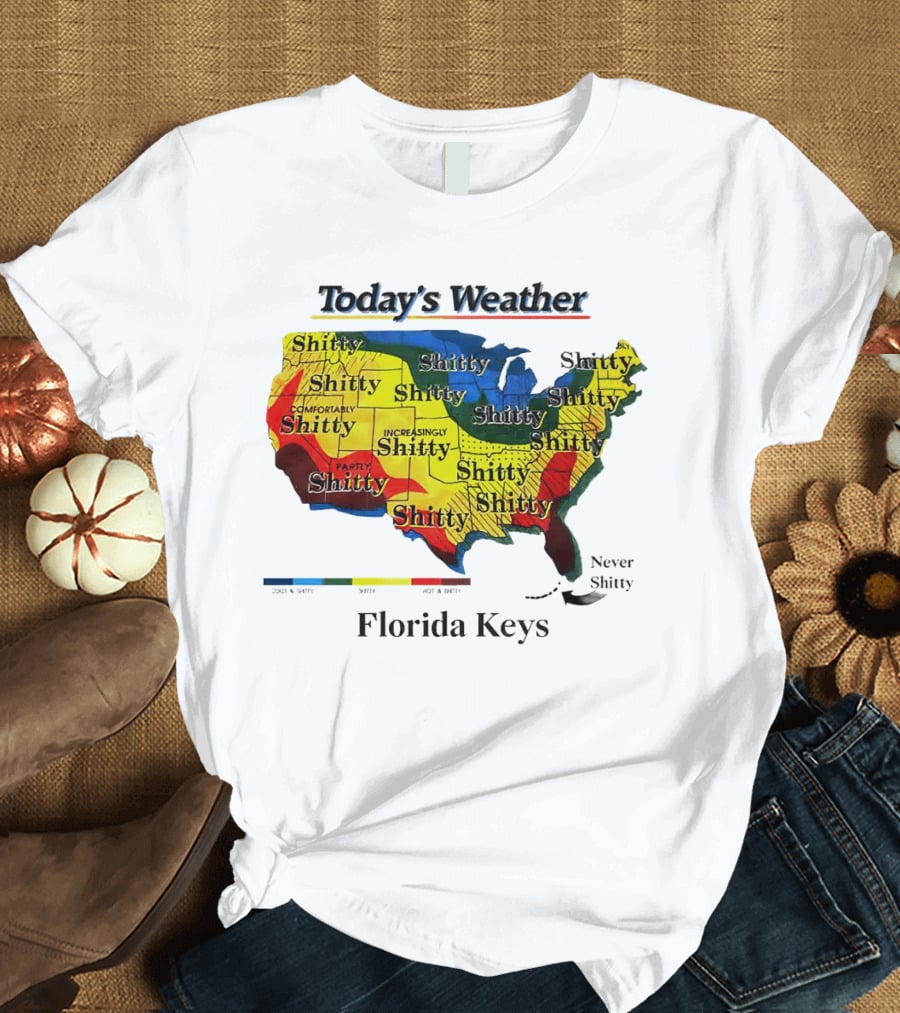 Today's Weather Map Florida Keys Shitty Increasingly Shitty Partly Never Shitty Shirt made from 100% pre-shrunk ring-spun cotton, unisex regular fit based on U.S. standard sizing. The shirt is designed, cut, sewn, and printed in the United States. Available in sizes S-5XL.