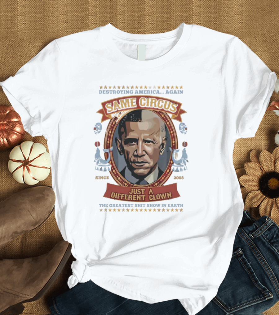 Destroying America Again Same Circus Just A Different Clown Since 2008 The Greatest Show On Earth Shirt made from 100% pre-shrunk ring-spun cotton, unisex regular fit based on U.S. standard sizing. The shirt is designed, cut, sewn, and printed in the United States. Available in sizes S-5XL.