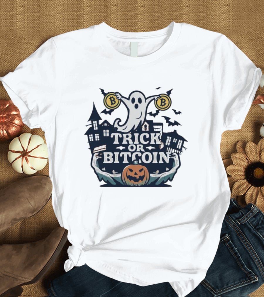 Trick Or Bitcoin Ghost Halloween With Haunted Houses And Pumpkin T-Shirt