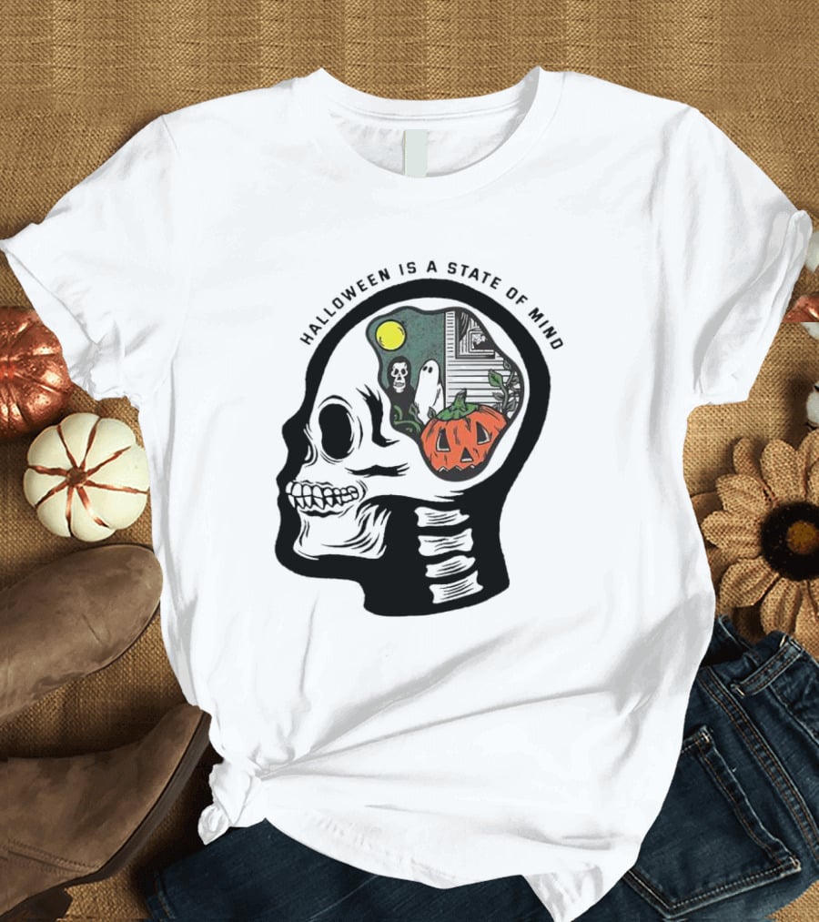 Halloween Is A State Of Mind Skull With Pumpkin And Ghosts T-Shirt