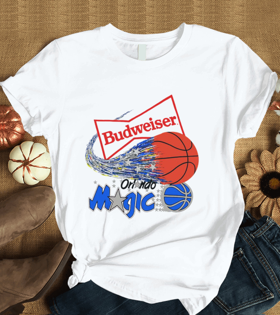 Budweiser Orlando Magic Basketball Shirt made from 100% pre-shrunk ring-spun cotton, unisex regular fit based on U.S. standard sizing. The shirt is designed, cut, sewn, and printed in the United States. Available in sizes S-5XL.
