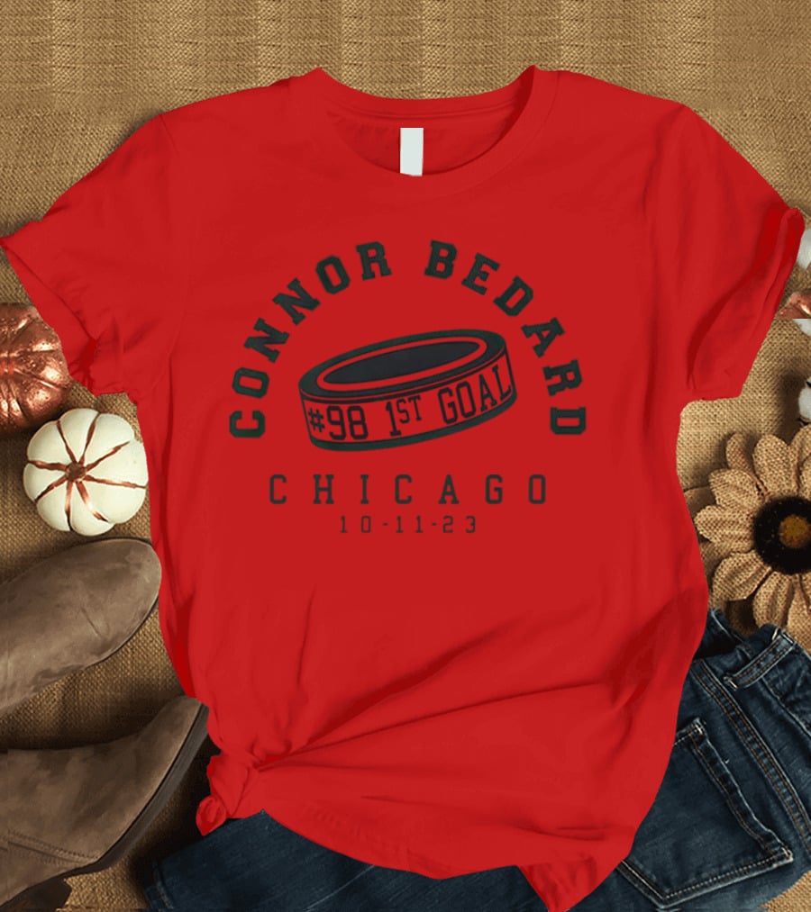 Connor Bedard #98 1st Goal Chicago 10-11-23 Shirt made from 100% pre-shrunk ring-spun cotton, unisex regular fit based on U.S. standard sizing. The shirt is designed, cut, sewn, and printed in the United States. Available in sizes S-5XL.