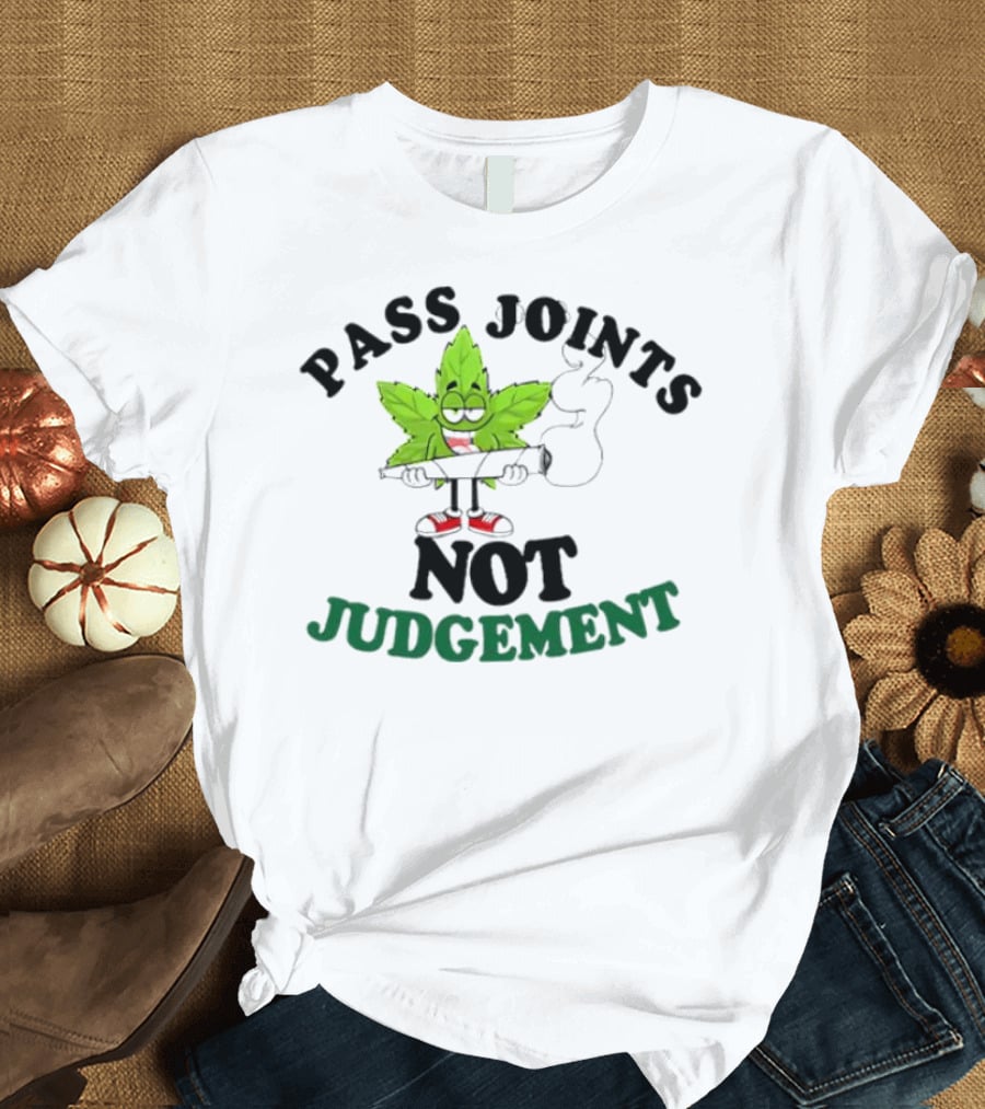 PASS JOINTS NOT JUDGEMENT Cartoon Leaf Holding Joint Shirt made from 100% pre-shrunk ring-spun cotton, unisex regular fit based on U.S. standard sizing. The shirt is designed, cut, sewn, and printed in the United States. Available in sizes S-5XL.