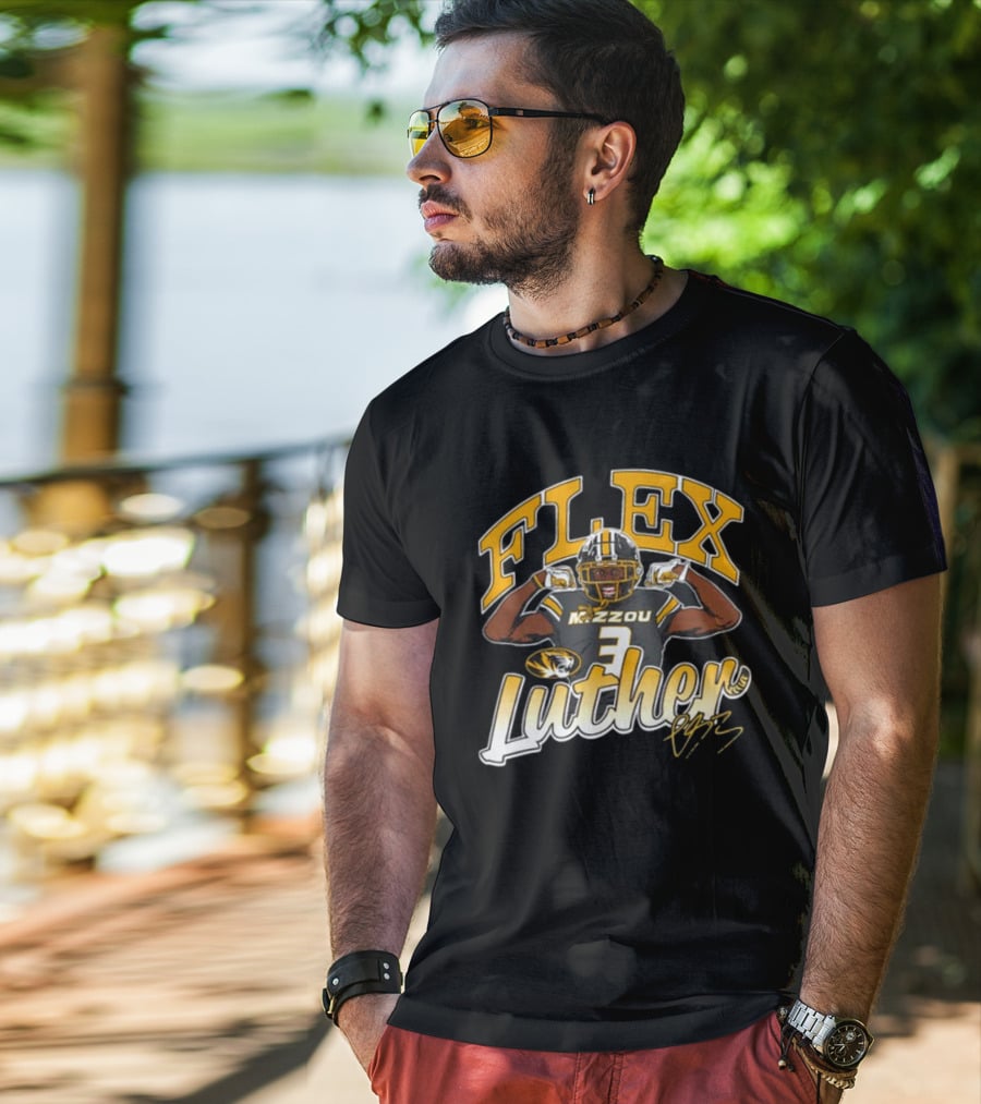 FLEX Mizzou Luther Burden Football Tiger 3 Signature Shirt made from 100% pre-shrunk ring-spun cotton, unisex regular fit based on U.S. standard sizing. The shirt is designed, cut, sewn, and printed in the United States. Available in sizes S-5XL.