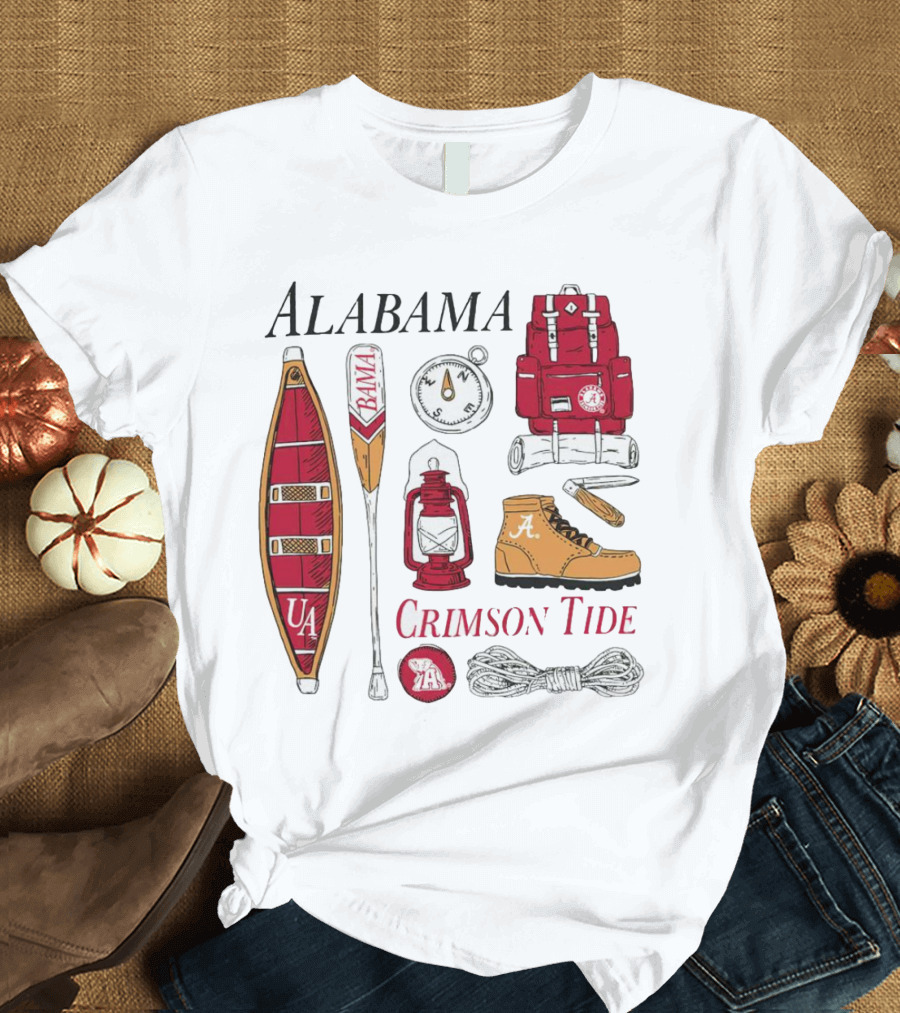 Alabama Crimson Tide Camping Gear and Outdoor Adventure Essentials Shirt made from 100% pre-shrunk ring-spun cotton, unisex regular fit based on U.S. standard sizing. The shirt is designed, cut, sewn, and printed in the United States. Available in sizes S-5XL.