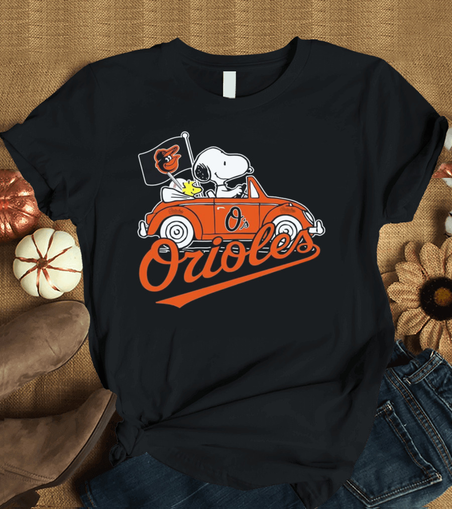 Snoopy And Woodstock Driving Baltimore Orioles Car With Flag T-Shirt
