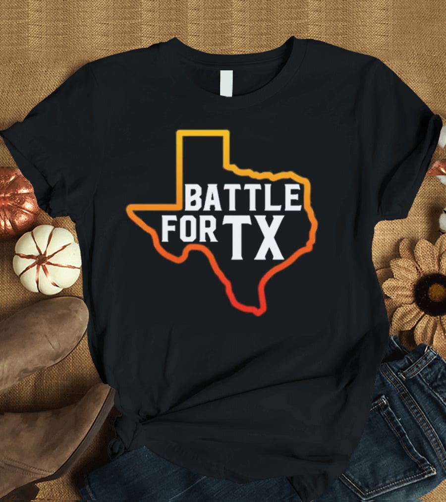 Battle for TX in Texas State Outline Shirt made from 100% pre-shrunk ring-spun cotton, unisex regular fit based on U.S. standard sizing. The shirt is designed, cut, sewn, and printed in the United States. Available in sizes S-5XL.