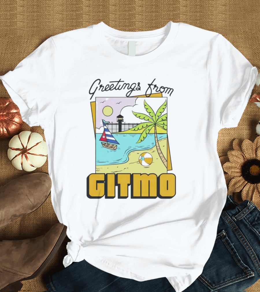 Greetings from Gitmo Palm Beach Scene with Sailboat and Volleyball Shirt made from 100% pre-shrunk ring-spun cotton, unisex regular fit based on U.S. standard sizing. The shirt is designed, cut, sewn, and printed in the United States. Available in sizes S-5XL.
