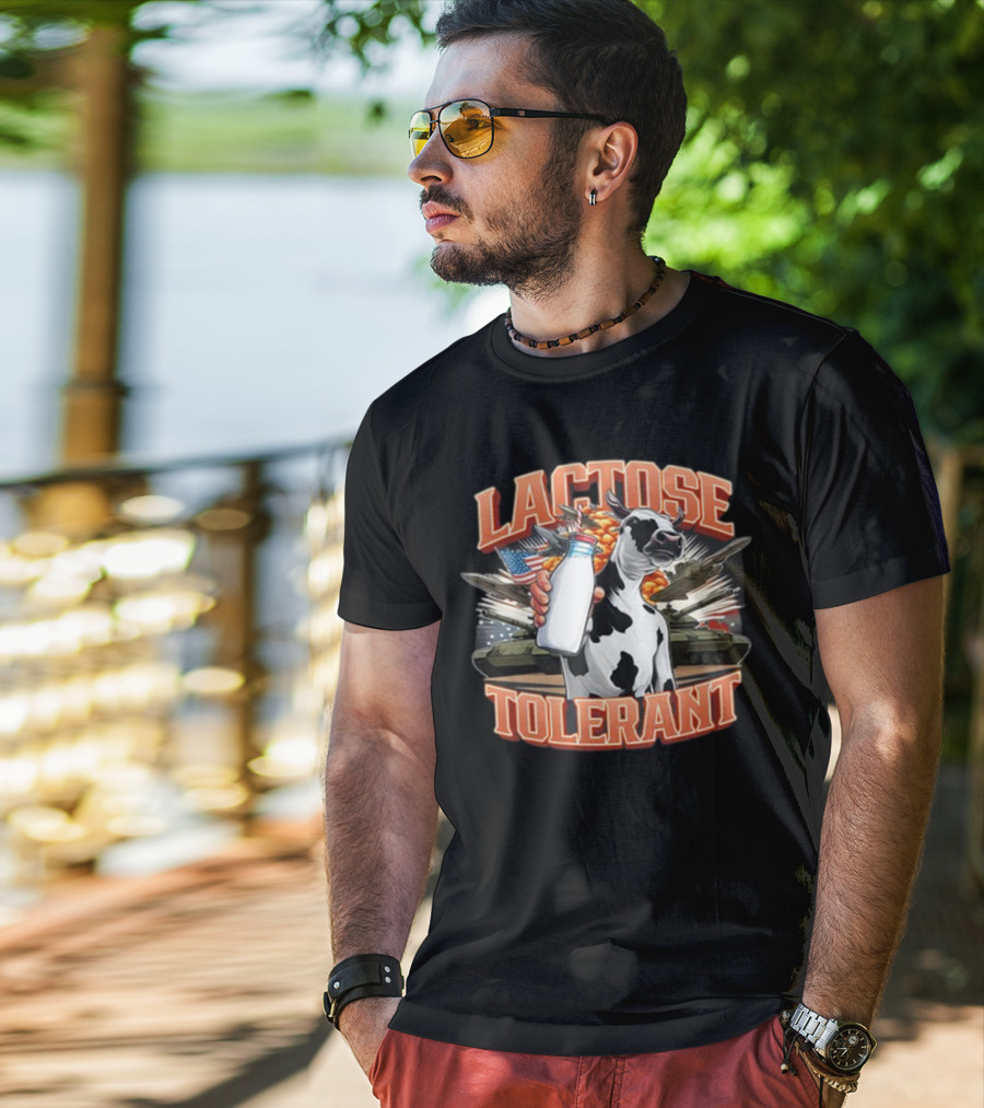 Lactose Tolerant Cow Holding Milk with Explosive Flags and Tanks Shirt made from 100% pre-shrunk ring-spun cotton, unisex regular fit based on U.S. standard sizing. The shirt is designed, cut, sewn, and printed in the United States. Available in sizes S-5XL.