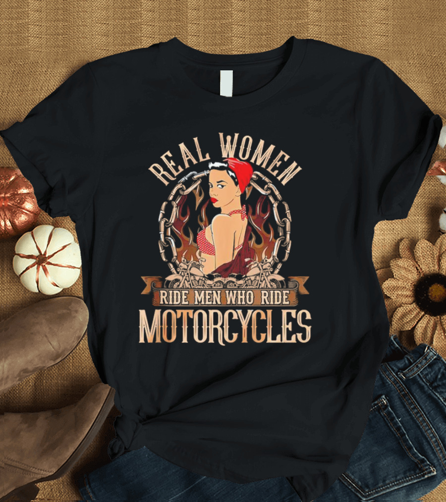 REAL WOMEN RIDE MEN WHO RIDE MOTORCYCLES VINTAGE BIKER PIN-UP WITH FLAMES AND CHAINS Shirt made from 100% pre-shrunk ring-spun cotton, unisex regular fit based on U.S. standard sizing. The shirt is designed, cut, sewn, and printed in the United States. Available in sizes S-5XL.