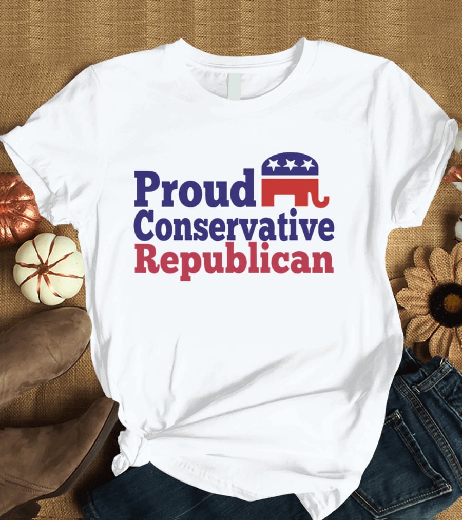 Proud Conservative Republican USA Elephant Shirt made from 100% pre-shrunk ring-spun cotton, unisex regular fit based on U.S. standard sizing. The shirt is designed, cut, sewn, and printed in the United States. Available in sizes S-5XL.
