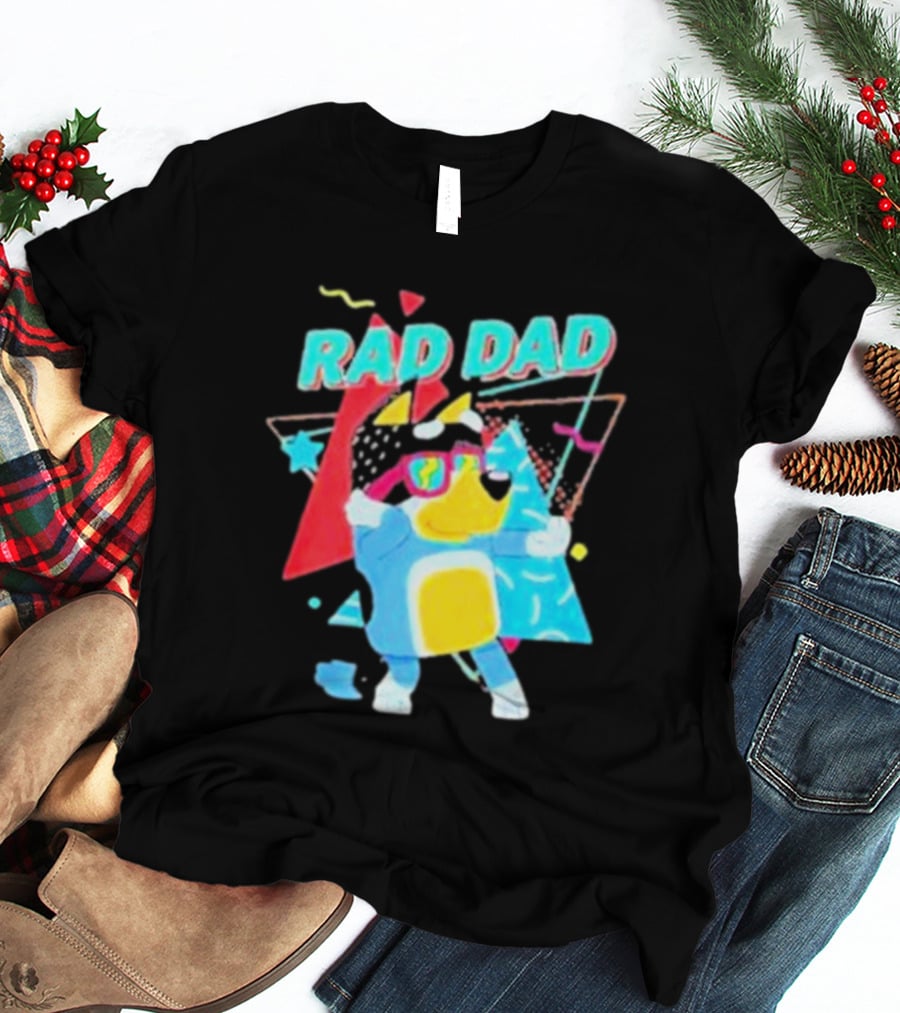 Rad Dad Colorful 80s Style Dog Shirt made from 100% pre-shrunk ring-spun cotton, unisex regular fit based on U.S. standard sizing. The shirt is designed, cut, sewn, and printed in the United States. Available in sizes S-5XL.