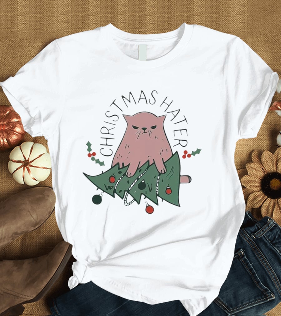 Christmas Hater Angry Cat With Broken Tree And Holly Decorations T-Shirt