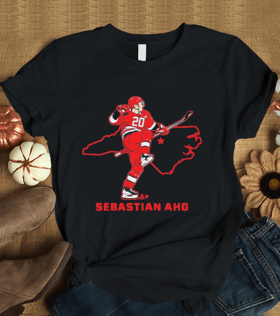 Sebastian Aho 20 Carolina Hurricanes State Outline Shirt made from 100% pre-shrunk ring-spun cotton, unisex regular fit based on U.S. standard sizing. The shirt is designed, cut, sewn, and printed in the United States. Available in sizes S-5XL.