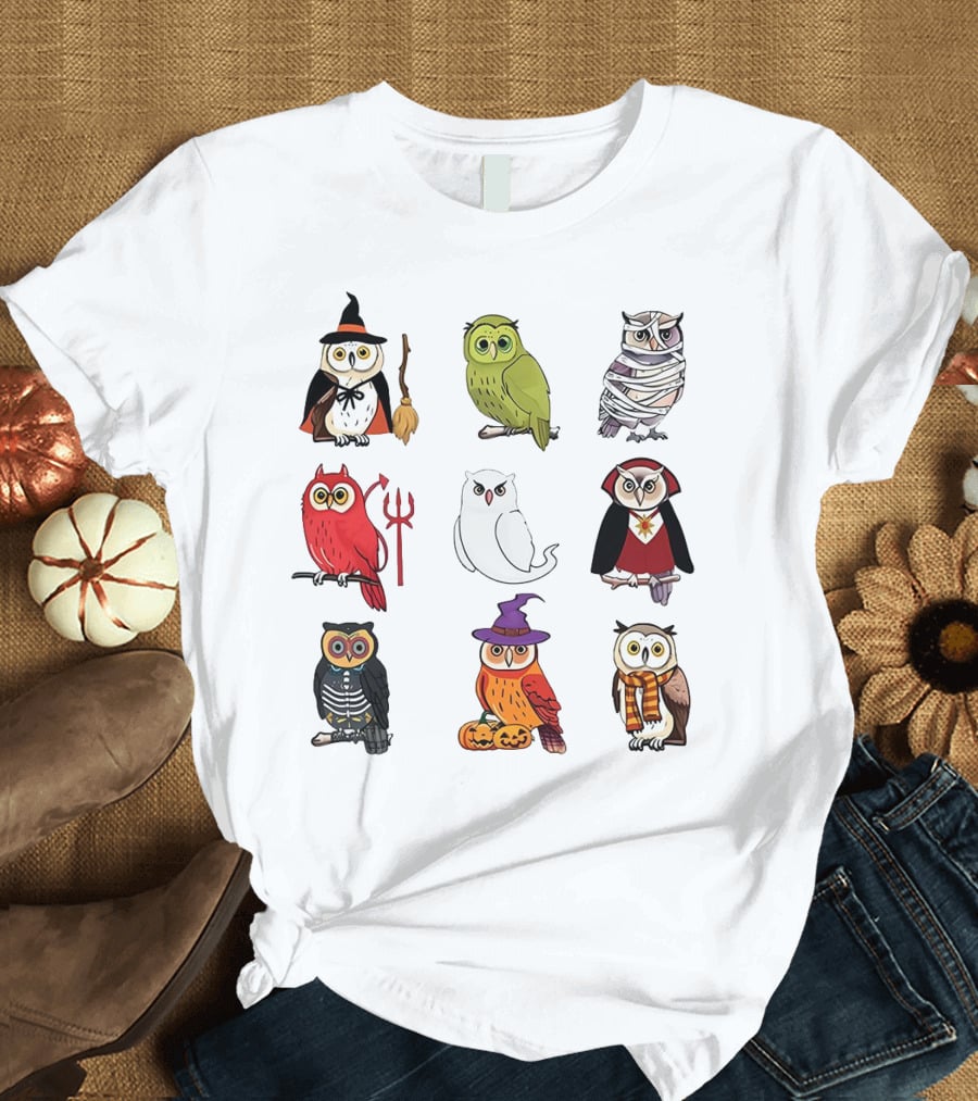 Cute Owls Halloween Witch Mummy Devil Skeleton Vampire Pumpkin Scarf T-Shirt