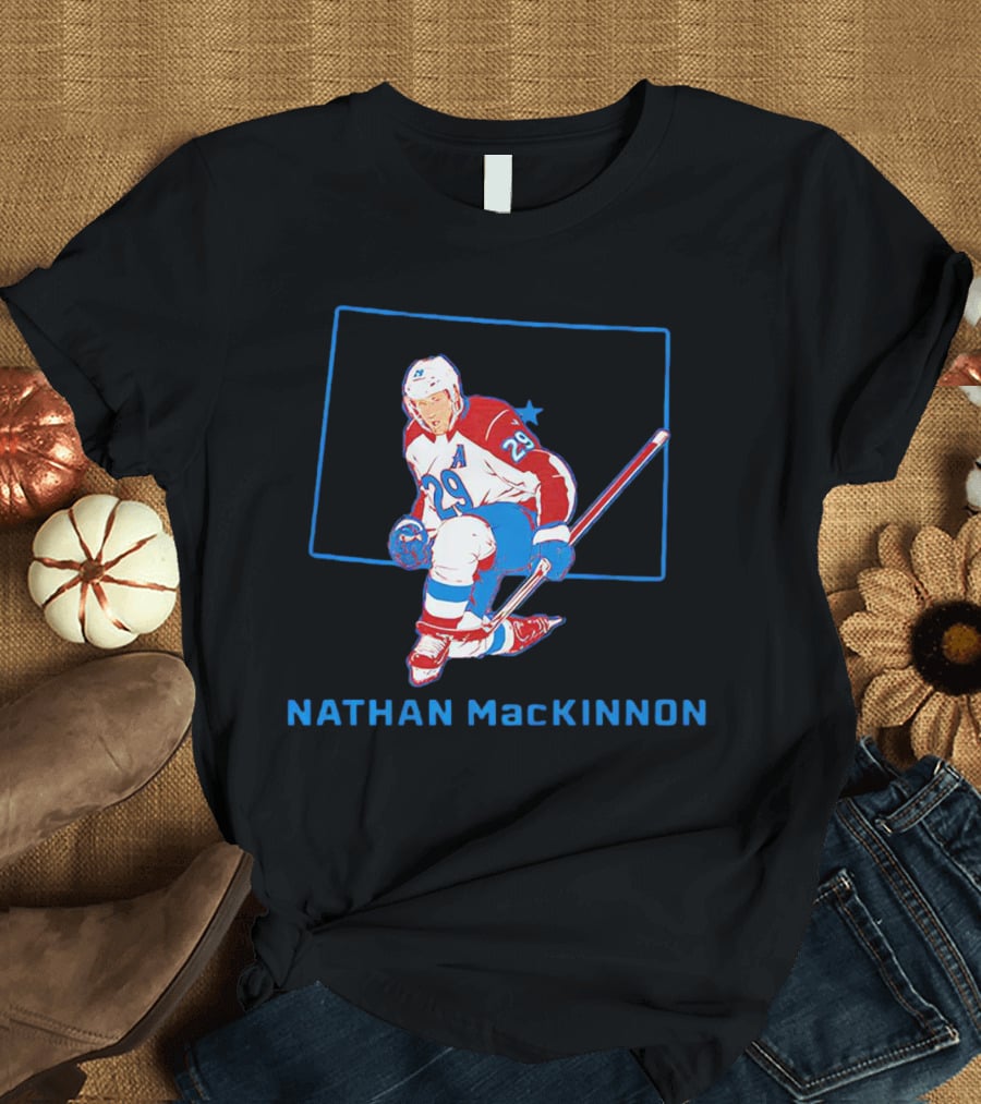 Nathan MacKinnon 29 Colorado Avalanche Star Shirt made from 100% pre-shrunk ring-spun cotton, unisex regular fit based on U.S. standard sizing. The shirt is designed, cut, sewn, and printed in the United States. Available in sizes S-5XL.