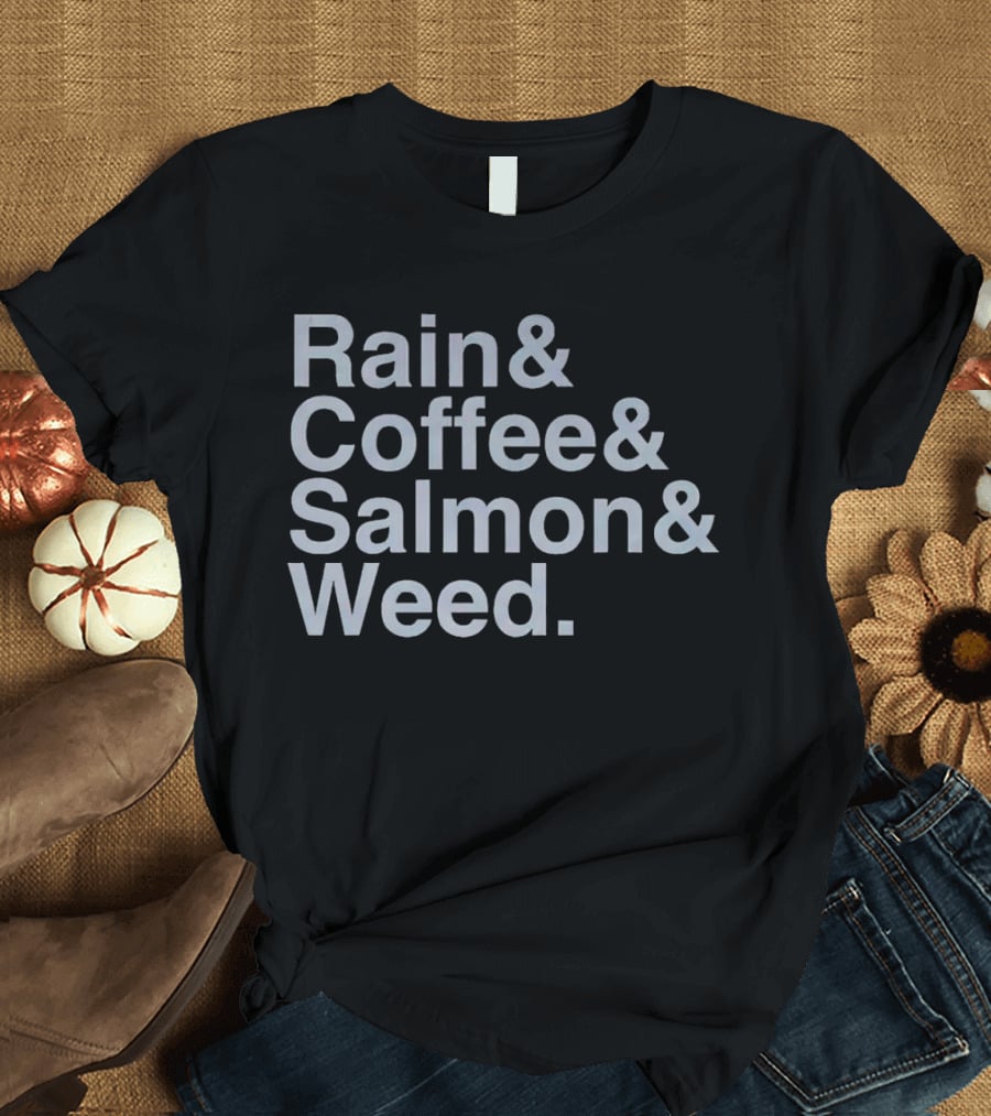 Rain Coffee Salmon Weed Seattle Vibes Shirt made from 100% pre-shrunk ring-spun cotton, unisex regular fit based on U.S. standard sizing. The shirt is designed, cut, sewn, and printed in the United States. Available in sizes S-5XL.