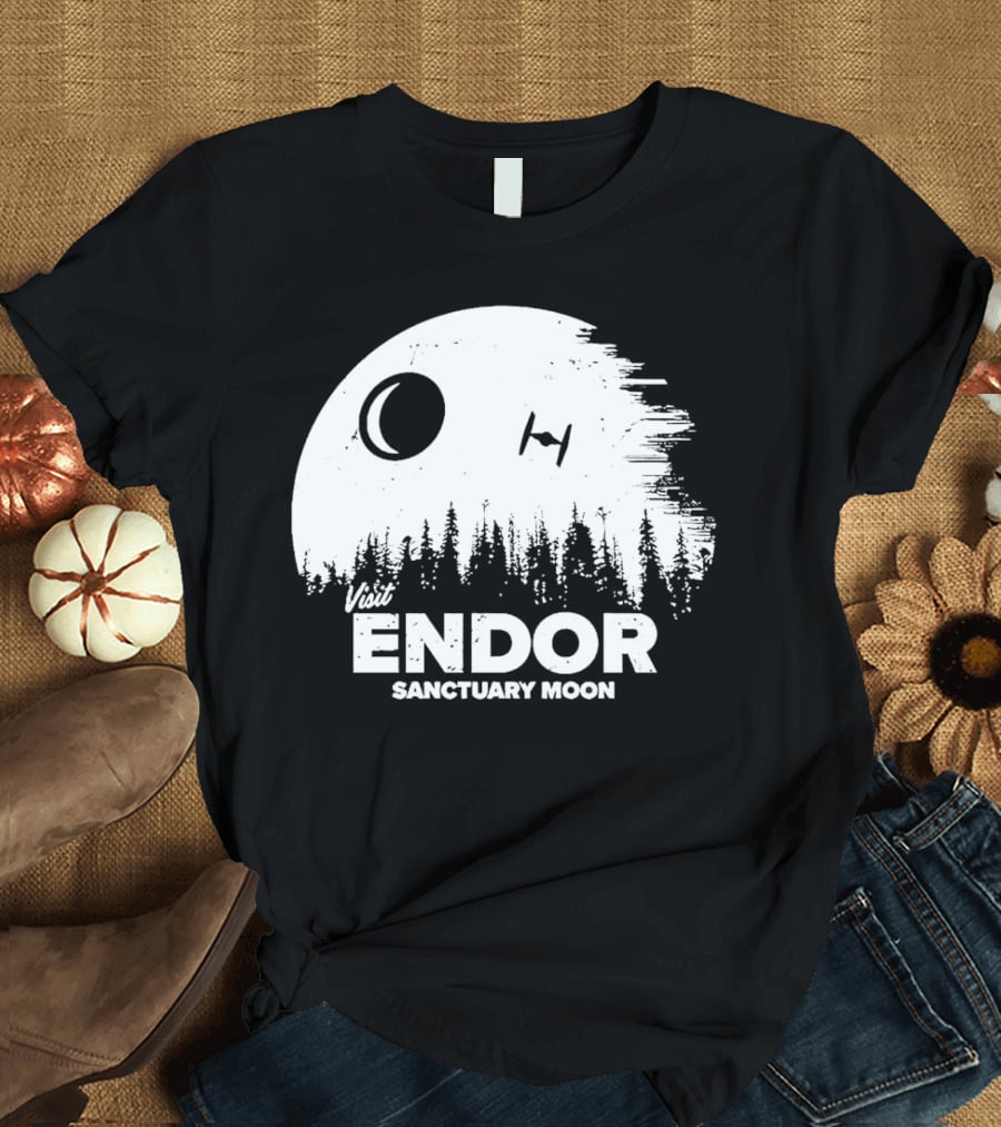 Visit Endor Sanctuary Moon Forest and Spaceship Scene Shirt made from 100% pre-shrunk ring-spun cotton, unisex regular fit based on U.S. standard sizing. The shirt is designed, cut, sewn, and printed in the United States. Available in sizes S-5XL.