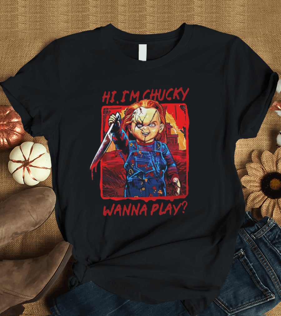 Hi I'm Chucky Wanna Play Creepy Doll with Knife and Overalls Shirt made from 100% pre-shrunk ring-spun cotton, unisex regular fit based on U.S. standard sizing. The shirt is designed, cut, sewn, and printed in the United States. Available in sizes S-5XL.