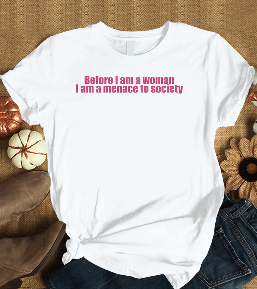 Before I Am a Woman I Am a Menace to Society Pink Shirt made from 100% pre-shrunk ring-spun cotton, unisex regular fit based on U.S. standard sizing. The shirt is designed, cut, sewn, and printed in the United States. Available in sizes S-5XL.