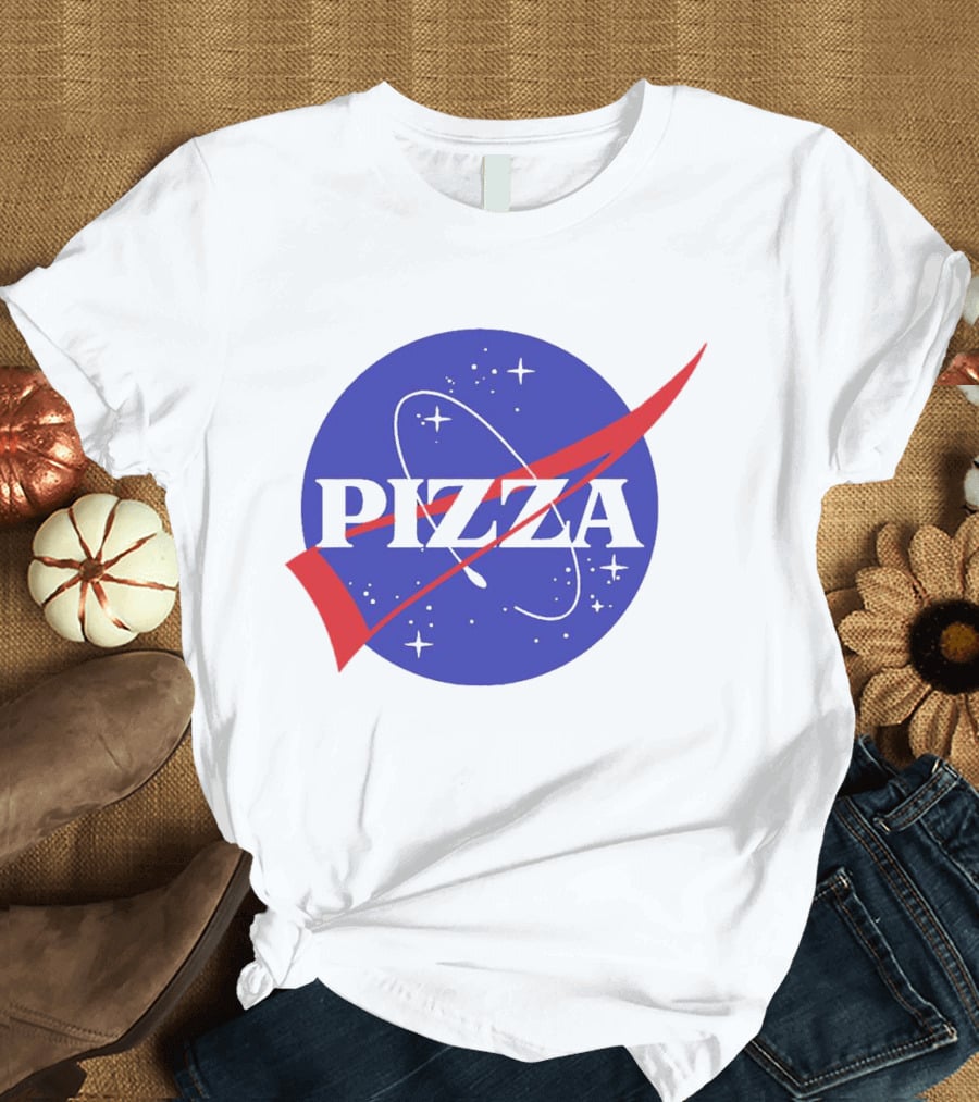 Pizza NASA Style Logo Parody Interstellar Shirt made from 100% pre-shrunk ring-spun cotton, unisex regular fit based on U.S. standard sizing. The shirt is designed, cut, sewn, and printed in the United States. Available in sizes S-5XL.