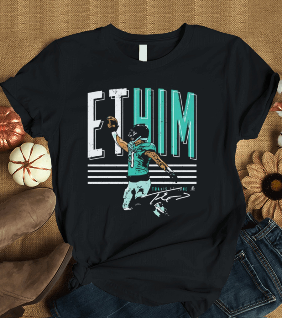 ET Him Travis Etienne Jacksonville Signature Shirt made from 100% pre-shrunk ring-spun cotton, unisex regular fit based on U.S. standard sizing. The shirt is designed, cut, sewn, and printed in the United States. Available in sizes S-5XL.