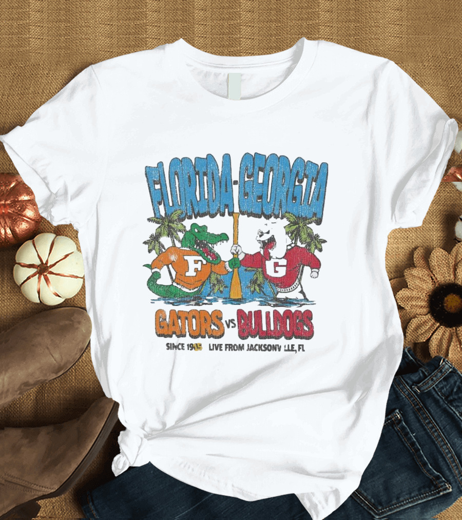 Florida Georgia Gators vs. Bulldogs Since 1933 Live From Jacksonville FL Shirt made from 100% pre-shrunk ring-spun cotton, unisex regular fit based on U.S. standard sizing. The shirt is designed, cut, sewn, and printed in the United States. Available in sizes S-5XL.