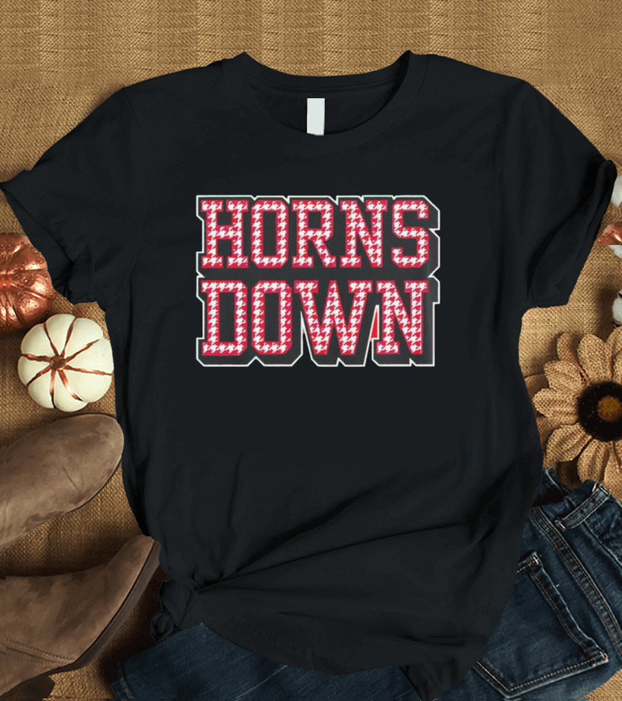 Houndstooth Horns Down Black Shirt made from 100% pre-shrunk ring-spun cotton, unisex regular fit based on U.S. standard sizing. The shirt is designed, cut, sewn, and printed in the United States. Available in sizes S-5XL.