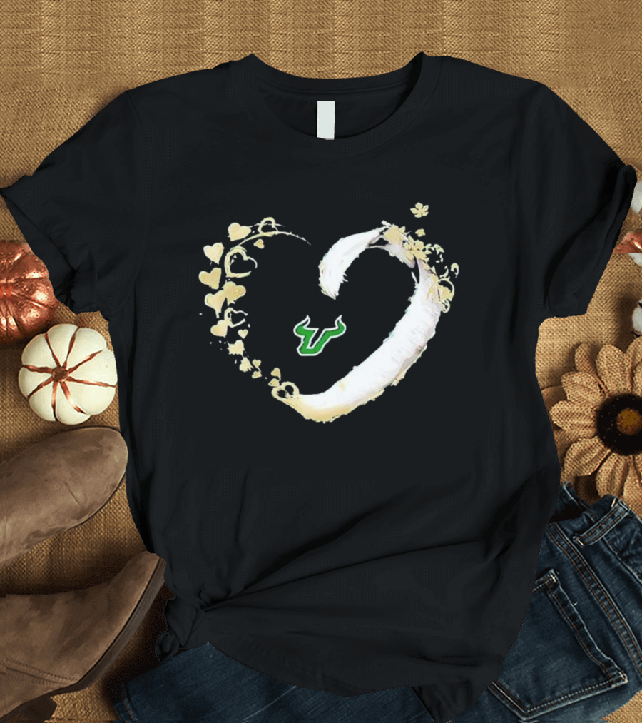 South Florida Bulls University Team Logo Heart Shirt made from 100% pre-shrunk ring-spun cotton, unisex regular fit based on U.S. standard sizing. The shirt is designed, cut, sewn, and printed in the United States. Available in sizes S-5XL.