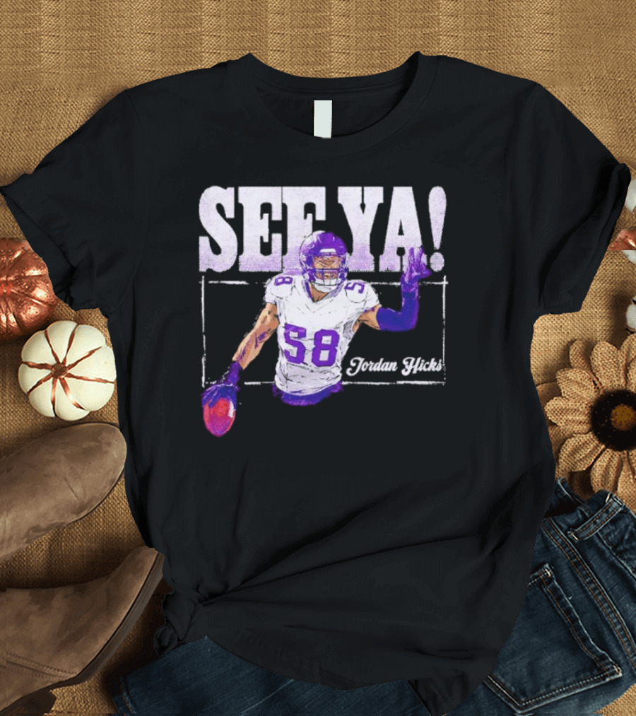 Jordan Hicks Minnesota See Ya Football Shirt made from 100% pre-shrunk ring-spun cotton, unisex regular fit based on U.S. standard sizing. The shirt is designed, cut, sewn, and printed in the United States. Available in sizes S-5XL.