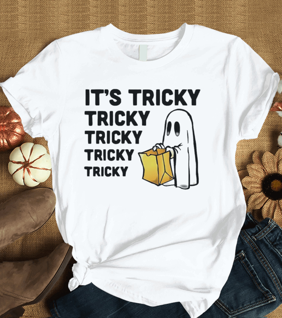 IT'S TRICKY TRICKY TRICKY TRICKY TRICKY HALLOWEEN GHOST WITH CANDY BAG Shirt made from 100% pre-shrunk ring-spun cotton, unisex regular fit based on U.S. standard sizing. The shirt is designed, cut, sewn, and printed in the United States. Available in sizes S-5XL.