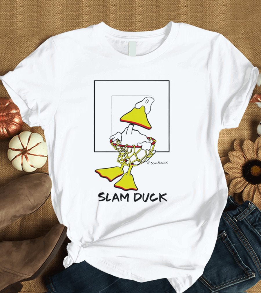 John Baron Slam Duck Basketball Humor Shirt made from 100% pre-shrunk ring-spun cotton, unisex regular fit based on U.S. standard sizing. The shirt is designed, cut, sewn, and printed in the United States. Available in sizes S-5XL.