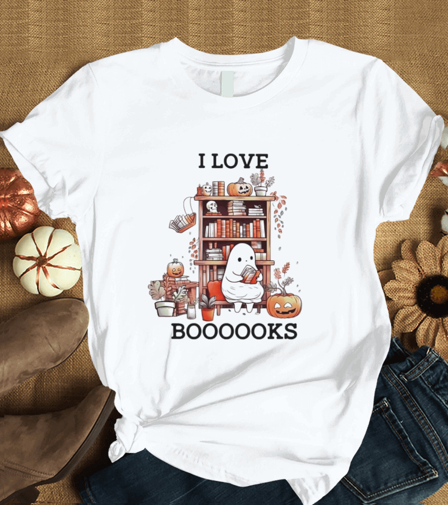 I Love Boooooks Ghost Reading With Pumpkins And Bookshelf Halloween T-Shirt