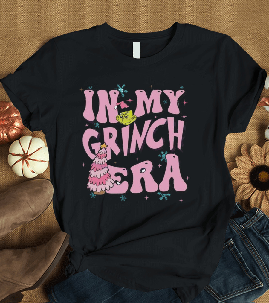 In My Grinch Era Pink Christmas Tree With Green Face And Santa Hat T-Shirt