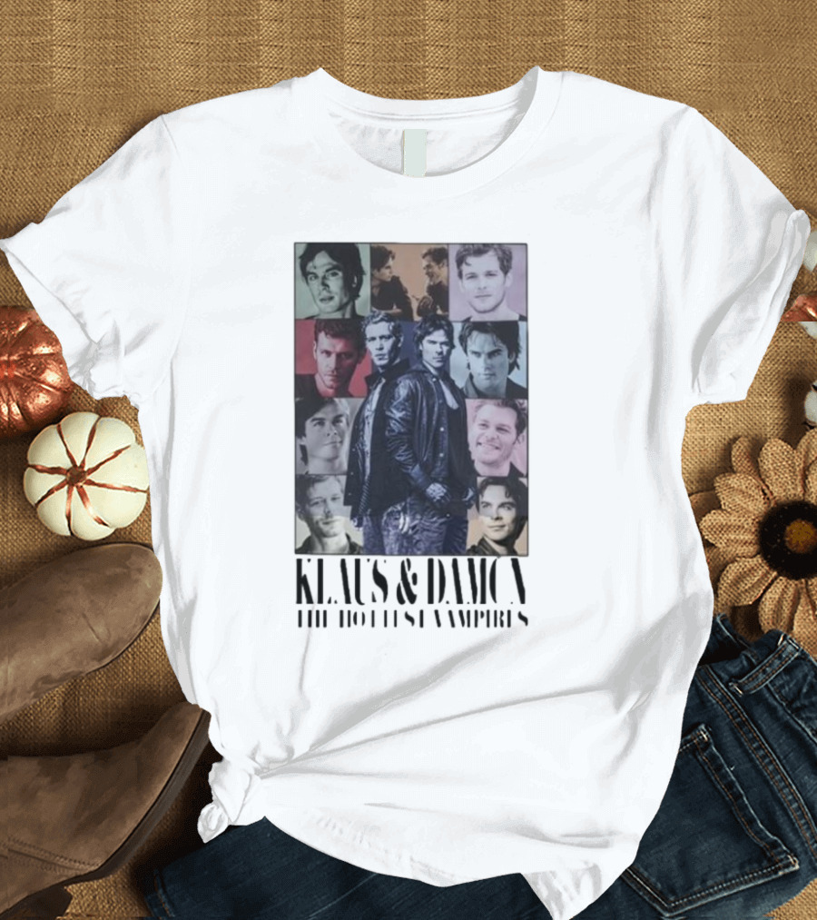 Klaus And Damon The Hottest Vampires Eras Tour Shirt made from 100% pre-shrunk ring-spun cotton, unisex regular fit based on U.S. standard sizing. The shirt is designed, cut, sewn, and printed in the United States. Available in sizes S-5XL.