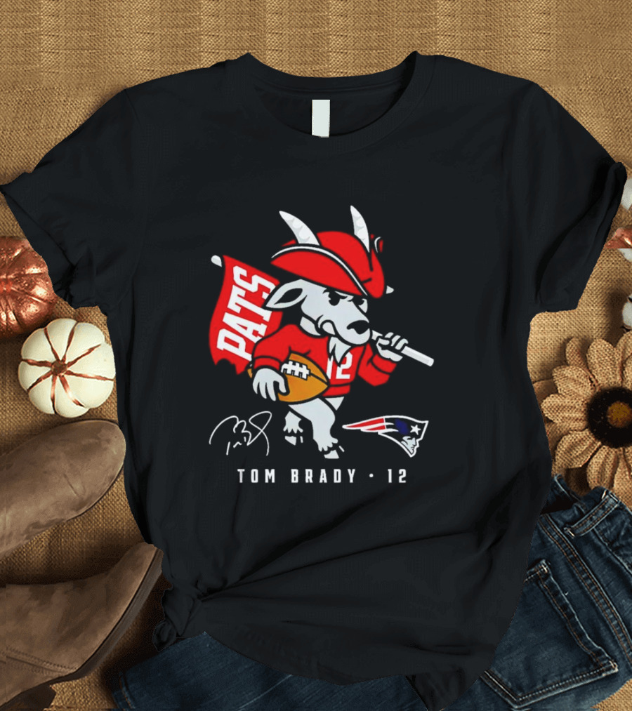 New England Patriots PATS Tom Brady 12 GOAT Logo Illustrative Character Shirt made from 100% pre-shrunk ring-spun cotton, unisex regular fit based on U.S. standard sizing. The shirt is designed, cut, sewn, and printed in the United States. Available in sizes S-5XL.