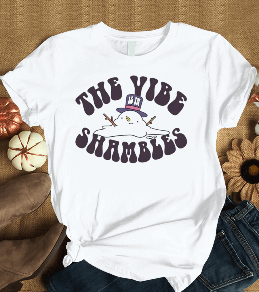 The Vibe is in Shambles Snowman with Top Hat and Melting Expression Shirt made from 100% pre-shrunk ring-spun cotton, unisex regular fit based on U.S. standard sizing. The shirt is designed, cut, sewn, and printed in the United States. Available in sizes S-5XL.