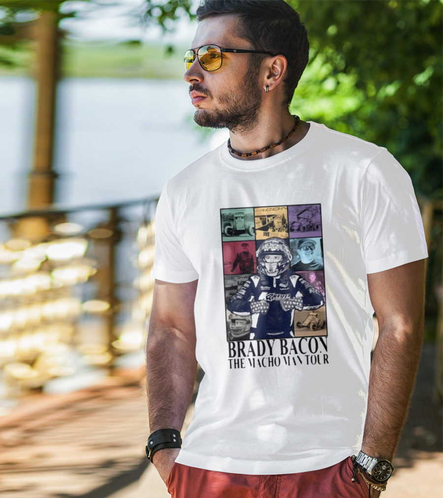 Brady Bacon Racing Iconography Collage The Macho Man Tour Shirt made from 100% pre-shrunk ring-spun cotton, unisex regular fit based on U.S. standard sizing. The shirt is designed, cut, sewn, and printed in the United States. Available in sizes S-5XL.