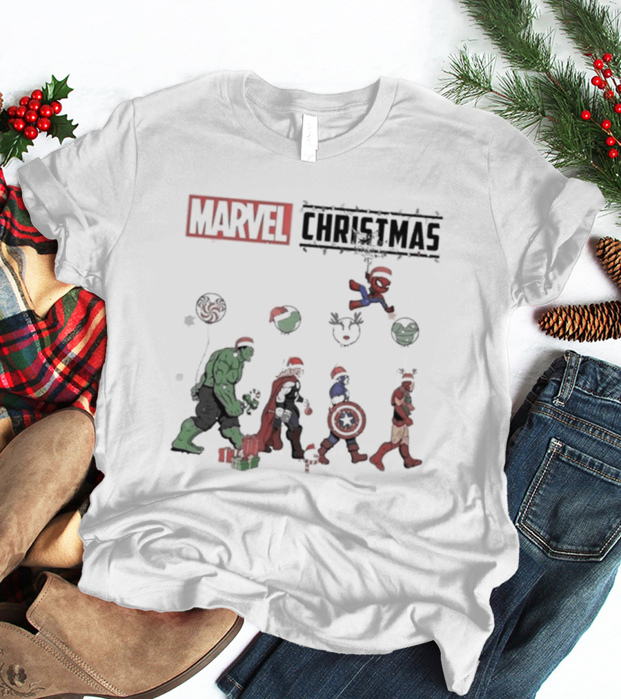 Marvel Christmas Superhero Characters In Santa Hats T-Shirt