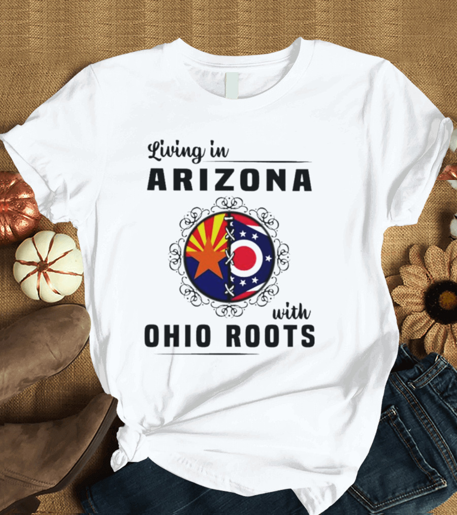 Living in Arizona with Ohio Roots Patchwork Flags Shirt made from 100% pre-shrunk ring-spun cotton, unisex regular fit based on U.S. standard sizing. The shirt is designed, cut, sewn, and printed in the United States. Available in sizes S-5XL.