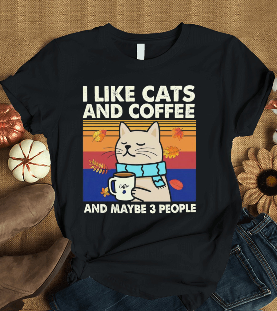 Trending I Like Cats And Coffee And Maybe 3 People Vintage Retro Autumn Cat With Coffee Mug T-Shirt