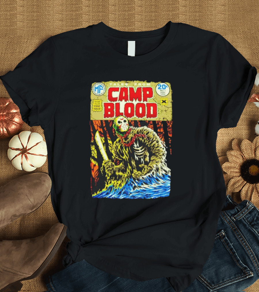 Tales from Camp Blood First Issue Jason Voorhees Comic Style 20¢ No. 1 May Shirt made from 100% pre-shrunk ring-spun cotton, unisex regular fit based on U.S. standard sizing. The shirt is designed, cut, sewn, and printed in the United States. Available in sizes S-5XL.