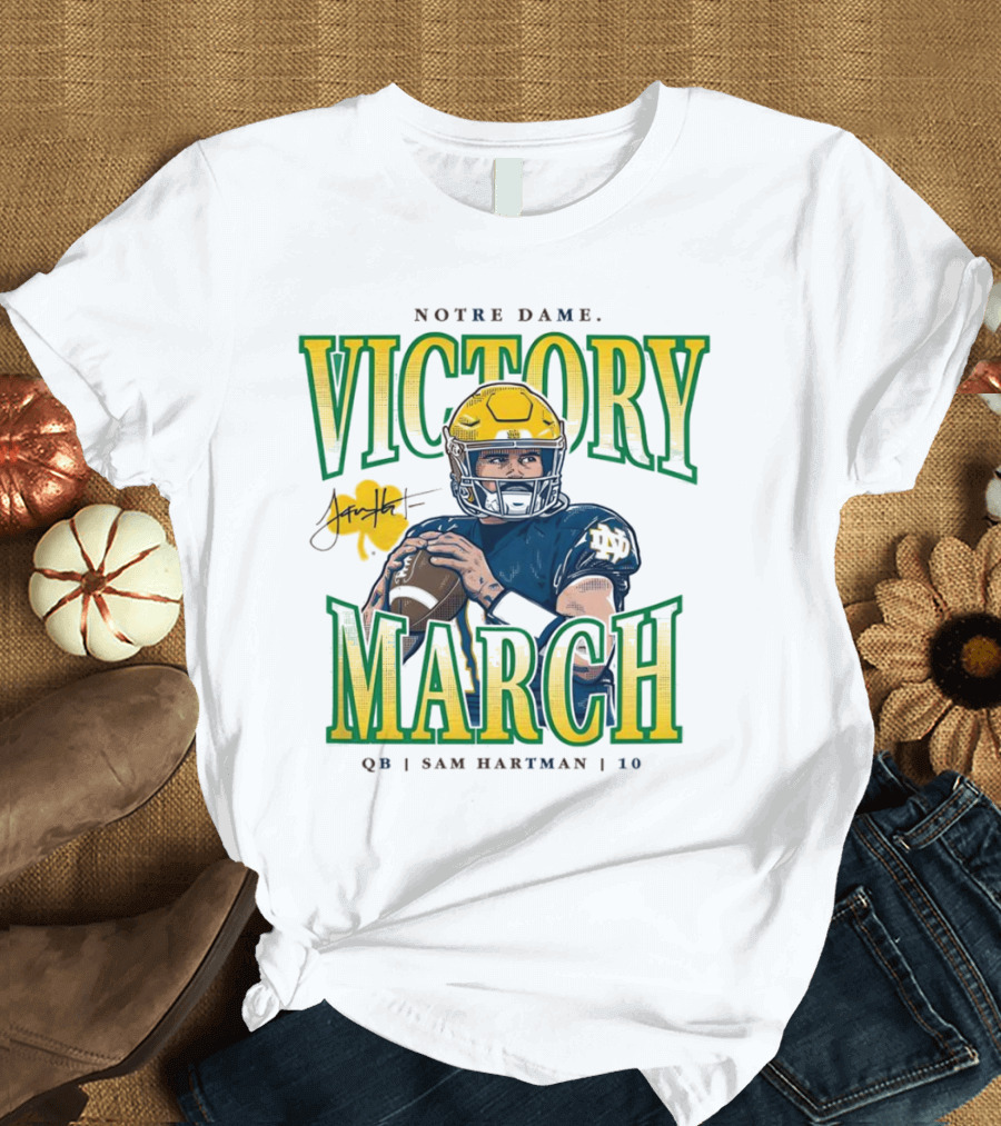 Notre Dame Victory March Sam Hartman QB 10 Shirt made from 100% pre-shrunk ring-spun cotton, unisex regular fit based on U.S. standard sizing. The shirt is designed, cut, sewn, and printed in the United States. Available in sizes S-5XL.