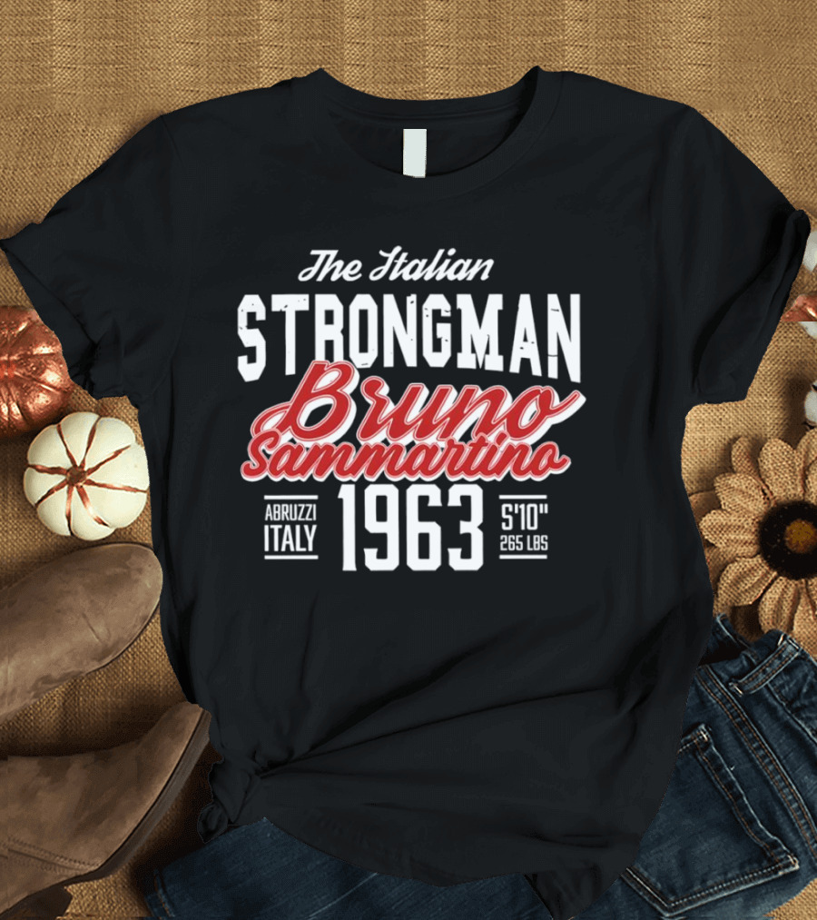 The Italian Strongman Bruno Sammartino 1963 Abruzzi Italy S'10'' 265 LBS Shirt made from 100% pre-shrunk ring-spun cotton, unisex regular fit based on U.S. standard sizing. The shirt is designed, cut, sewn, and printed in the United States. Available in sizes S-5XL.