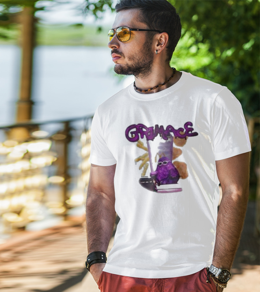 Grimace Giggle Grab Purple Character with Sunglasses Shirt made from 100% pre-shrunk ring-spun cotton, unisex regular fit based on U.S. standard sizing. The shirt is designed, cut, sewn, and printed in the United States. Available in sizes S-5XL.