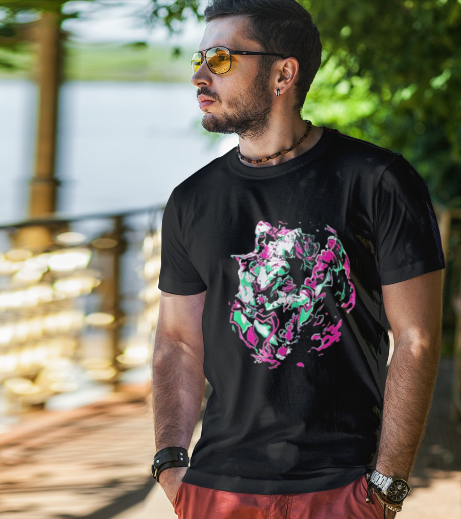 To maintain the vibrancy of the print, wash the shirt inside-out in cold water and avoid using bleach. Tumble dry low or hang dry. Do not iron directly on the print.